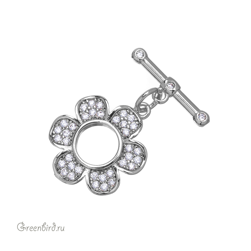 Фурнитура для бижутерии - замок-тоггл в форме цветка, украшенный фианитами. Материал: латунь, покрытие: родий. Размер: 15 мм, внутренний диаметр: 5,5 мм, палочка: 16,5 мм. Производство: Китай. Цена указана за 1 штуку.