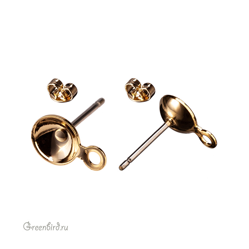 Фурнитура для бижутерии - пуссеты с чашечкой и петелькой. Материал чашечки: латунь, покрытие: золото, штырьки: хирургическая сталь. Диаметр: 6,1 мм, высота с петелькой: 9,6 мм, внутренний диаметр петельки: 1,55 мм, толщина штырька 0,75 мм. Подходит для бусин 6 мм. Производство: Корея. Цена указана за пару.