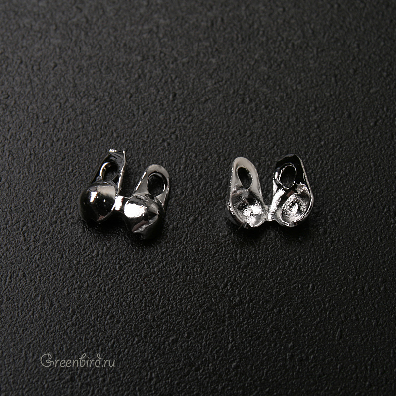 Фурнитура для бижутерии - наконечник-каллот. Материал: латунь, покрытие: родий. Размер в закрытом виде: 3,9 x 2,2 мм. Подходит под цепочку с шариками 1,2 мм. Производство: Корея. Цена указана за 1 штуку.