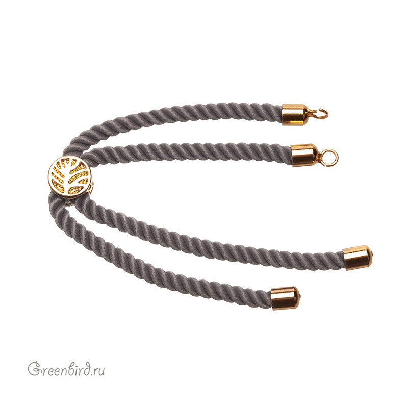 Фурнитура для бижутерии - плетеный витой шнур с колечками для крепления центрального элемента и стоппером. Материал шнура: нейлон; материал: латунь, покрытие: золото. Цвет: серый. Общая длина с колечками: 11,5 см, ширина: 4 мм, размер стоппера: 8,1 х 5,6 мм, внутренний диаметр колечек: 2,2 мм. Производство: Китай. Цена указана за 1 шт.