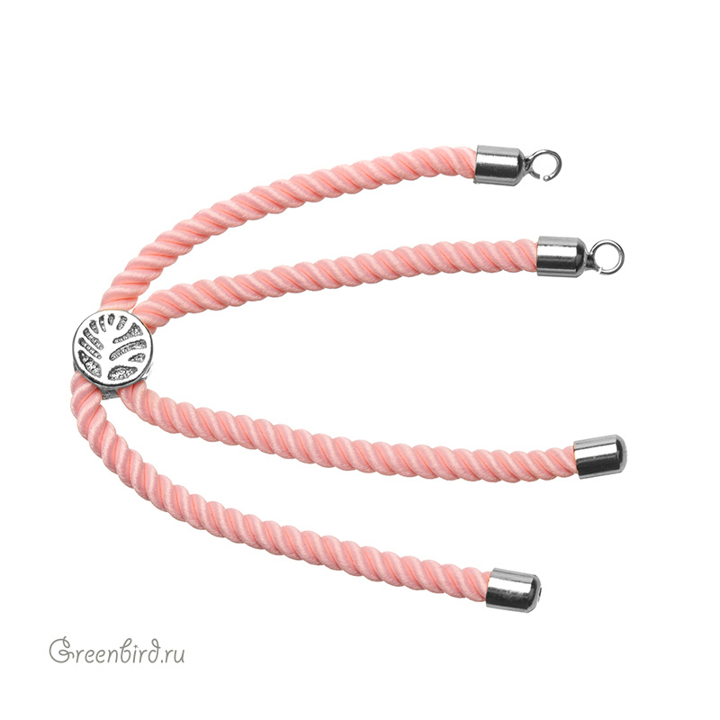 Фурнитура для бижутерии - плетеный витой шнур с колечками для крепления центрального элемента и стоппером. Материал шнура: нейлон; материал: латунь, покрытие: родий. Цвет: розовый. Общая длина с колечками: 11,5 см, ширина: 4 мм, размер стоппера: 8,1 х 5,6 мм, внутренний диаметр колечек: 2,2 мм. Производство: Китай. Цена указана за 1 шт.