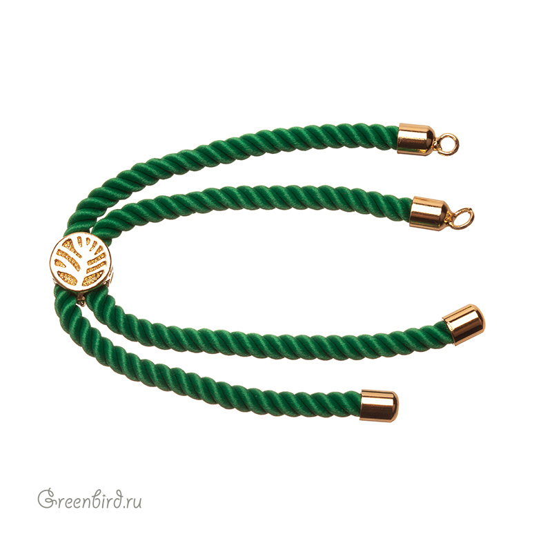 Фурнитура для бижутерии - плетеный витой шнур с колечками для крепления центрального элемента и стоппером. Материал шнура: нейлон; материал: латунь, покрытие: золото. Цвет: зеленый. Общая длина с колечками: 11,5 см, ширина: 4 мм, размер стоппера: 8,1 х 5,6 мм, внутренний диаметр колечек: 2,2 мм. Производство: Китай. Цена указана за 1 шт.