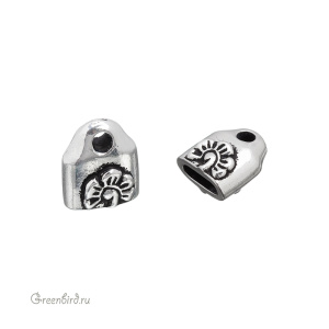 Фурнитура для бижутерии - концевик-кримп (наконечник для плоского шнура). Цвет: античное серебро. Размер: 10 х 8,8 х 6 мм, отверстие: 2 мм. Подходит для шнура размером 6 х 2 мм. Цена указана за 1 шт.