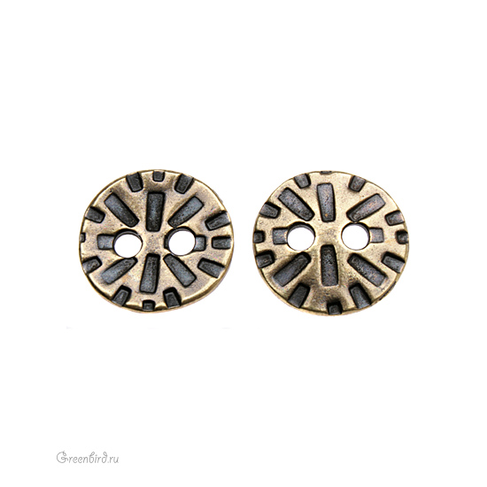 Фурнитура для шитья и рукоделия - металлическая пуговица. Цвет: античная латунь. Размер: 15 мм, отверстия: 3 мм. Цена указана за 1 шт.