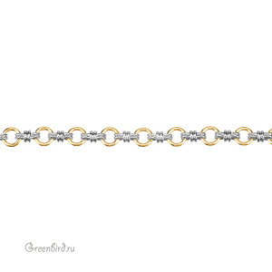 Фурнитура для бижутерии - цепочка фигурная с крупными незапаянными звеньями. Материал: латунь, покрытие: родий / золото. Размер круглых звеньев: 8 х 8 x 1,6 мм, размер звеньев-сцепок: 10 х 5 x 5 мм. Производство: Китай. Цена указана за 30 см. При заказе 2 или 3 единиц этого товара вы получите отрезок длиной 60 или 90 см соответственно.