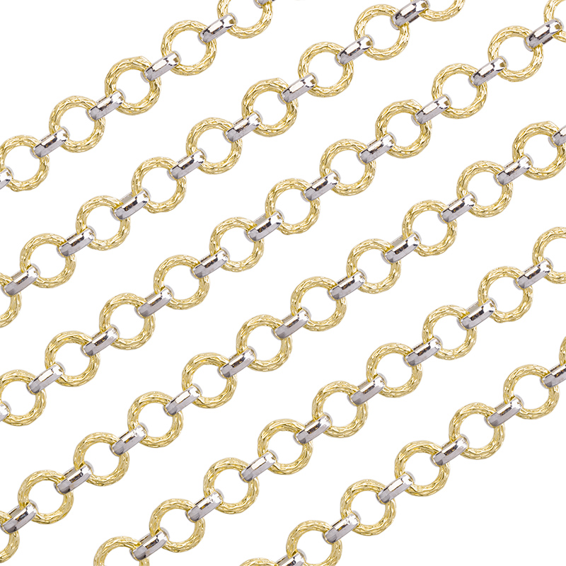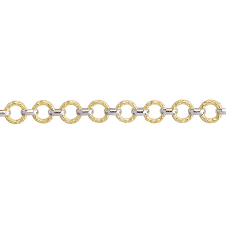 Фурнитура для бижутерии - цепочка фигурная, текстурированные кольца с крупными незапаянными звеньями. Материал: латунь, покрытие: родий / золото. Размер круглых звеньев: 12 х 12 x 2,2 мм, размер звеньев-сцепок: 9 х 7 x 3 мм. Производство: Китай. Цена указана за 30 см. При заказе 2 или 3 единиц этого товара вы получите отрезок длиной 60 или 90 см соответственно.