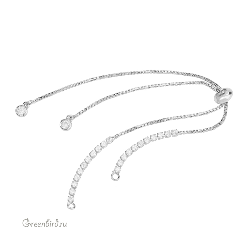 Фурнитура для бижутерии - подвеска-застежка в виде двух цепочек, украшенных фианитами, со стоппером с силиконовой вставкой. Материал: латунь, покрытие: родий. Общая длина каждой цепочки: 13,6 см, длина цепочки с фианитами: 2,8 см, длина плетеной цепочки: 9,7 см, размер стоппера: 7,1 х 3 мм. Производство: Китай. Цена указана за 1 шт.