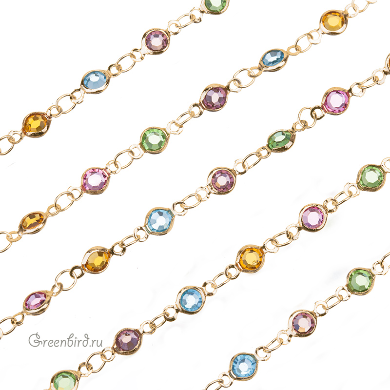 Фурнитура для бижутерии - цепочка декоративная с фианитами различных цветов в форме круглого плоского коннектора. Материал: латунь, покрытие: золото. Размер элемента-коннектора: 10 х 4,6 мм, толщина: 1,9 мм. Размер соединительного колечка: 3,9 х 3,2 мм. Производство: Китай. Цена указана за 10 см. При заказе 2 или 3 единиц этого товара вы получите отрезок длиной 20 или 30 см соответственно.