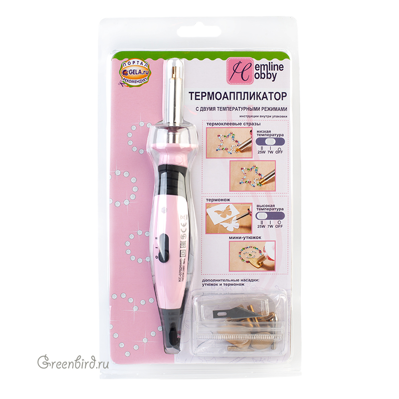 Термоаппликатор Hemline Hobby с двумя температурными режимами предназначен для работы с термостразами (клеевыми кристаллами горячей фиксации), аппликациями, а также для резки тканей и пенопласта.