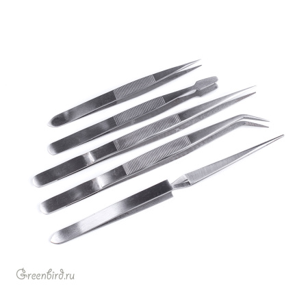 Набор из пяти инструментов-пинцетов для всех видов работ. Цельнометаллические, материал: нержавеющая сталь. Насечки препятствуют скольжению в руке, заточенные кончики облегчают работу с самыми мелкими предметами.