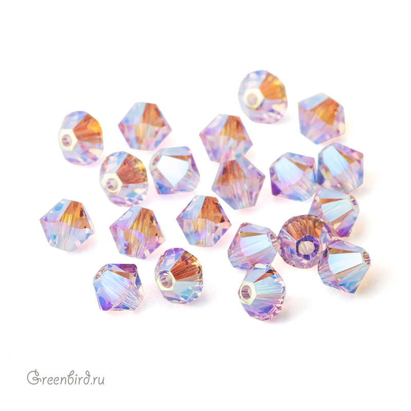 Компонент для бижутерии Swarovski – бусины-биконусы (Swarovski Биконусы). Размер: 4 мм, отверстие: 0,6 мм, цвет: Light Amethyst AB 2X (#212AB2). Производство: Австрия. Цена указана за 20 шт.\n