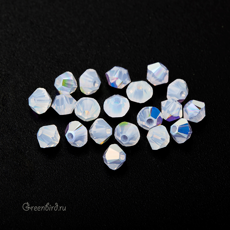 Компонент для бижутерии Swarovski – бусины-биконусы (Swarovski Биконусы). Размер: 3 мм, отверстие: 0,82 мм, цвет: White Opal AB (#234AB). Производство: Австрия. Цена указана за 20 шт.\n