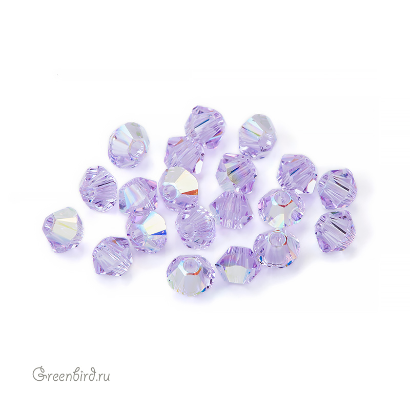 Компонент для бижутерии Swarovski – бусины-биконусы (Swarovski Биконусы). Размер: 3 мм, отверстие: 0,82 мм, цвет: Violet AB (#371AB). Производство: Австрия. Цена указана за 20 шт.\n