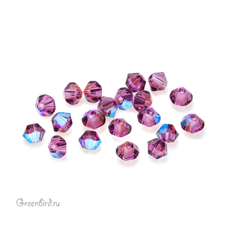 Компонент для бижутерии Swarovski – бусины-биконусы (Swarovski Биконусы). Размер: 3 мм, отверстие: 0,82 мм, цвет: Amethyst Shimmer (#204SHIM). Производство: Австрия. Цена указана за 20 шт.