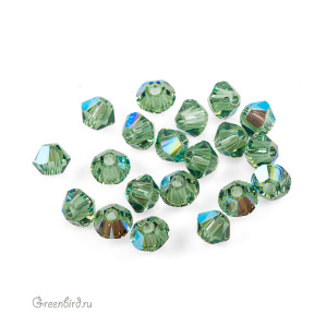 Компонент для бижутерии Swarovski – бусины-биконусы (Swarovski Биконусы). Размер: 3 мм, отверстие: 0,82 мм, цвет: Erinite Shimmer (#360SHIM). Производство: Австрия. Цена указана за 20 шт.