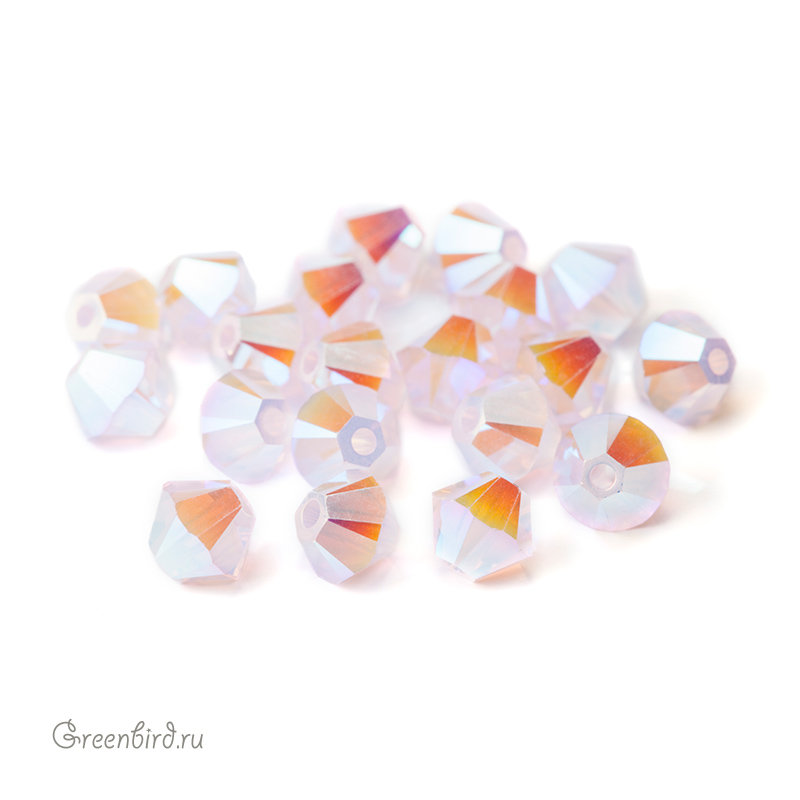 Компонент для бижутерии Swarovski – бусины-биконусы (Swarovski Биконусы). Размер: 4 мм, отверстие: 0,6 мм, цвет: Rose Water Opal AB 2X (#395AB2). Производство: Австрия. Цена указана за 20 шт.\n