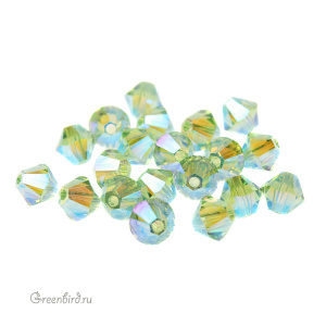 Компонент для бижутерии Swarovski – бусины-биконусы (Swarovski Биконусы). Размер: 4 мм, отверстие: 0,6 мм, цвет: Peridot Aurore Boreale 2X (#214AB2). Производство: Австрия. Цена указана за 20 шт.