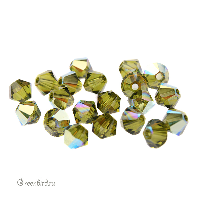 Компонент для бижутерии Swarovski – бусины-биконусы (Swarovski Биконусы). Размер: 4 мм, отверстие: 0,6 мм, цвет: Olivine AB (#228AB). Производство: Австрия. Цена указана за 20 шт.