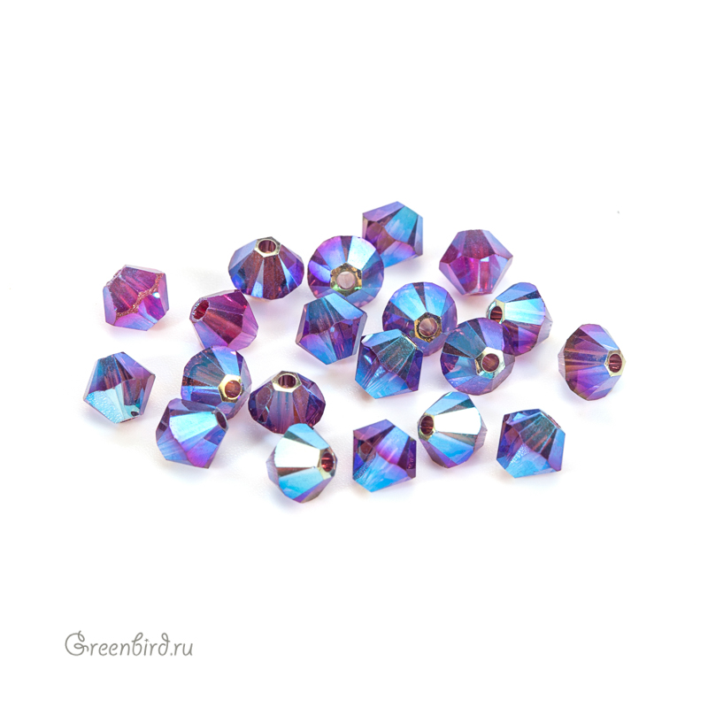 Компонент для бижутерии Swarovski – бусины-биконусы (Swarovski Биконусы). Размер: 4 мм, отверстие: 0,6 мм, цвет: Amethyst AB 2X (#204AB2). Производство: Австрия. Цена указана за 20 шт.\n