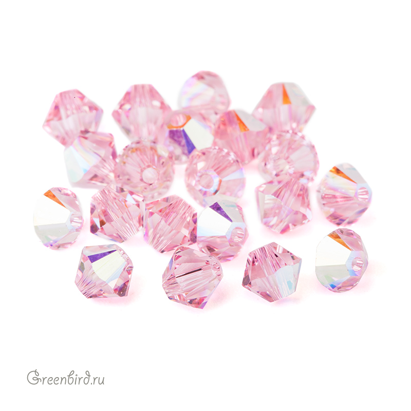 Компонент для бижутерии Swarovski – бусины-биконусы (Swarovski Биконусы). Размер: 4 мм, отверстие: 0,6 мм, цвет: Light Rose AB (#223AB). Производство: Австрия. Цена указана за 20 шт.\n