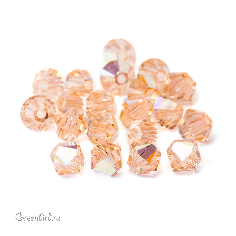 Компонент для бижутерии Swarovski – бусины-биконусы (Swarovski Биконусы). Размер: 4 мм, отверстие: 0,6 мм, цвет: Light Peach AB (#362AB). Производство: Австрия. Цена указана за 20 шт.\n