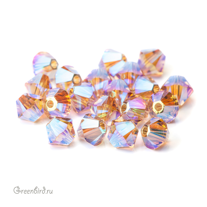 Компонент для бижутерии Swarovski – бусины-биконусы (Swarovski Биконусы). Размер: 4 мм, отверстие: 0,6 мм, цвет: Light Colorado Topaz AB 2X (#246AB2). Производство: Австрия. Цена указана за 20 шт.\n