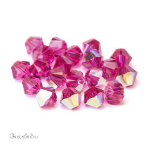 Swarovski 5328 Xilion Bicone Bead — биконусы или двуконусные бусины с фирменной огранкой Xilion. Эта огранка создаёт максимальный блеск за счёт дополнительных фасеток на гранях. Компонент для бижутерии и вышивки. Размер: 4 мм, отверстие: 0,8 мм. Цвет: фуксия с радужным эффектом / Fuchsia AB (#502AB). Материал: стекло. Производство: Австрия. Цена указана за 20 шт.