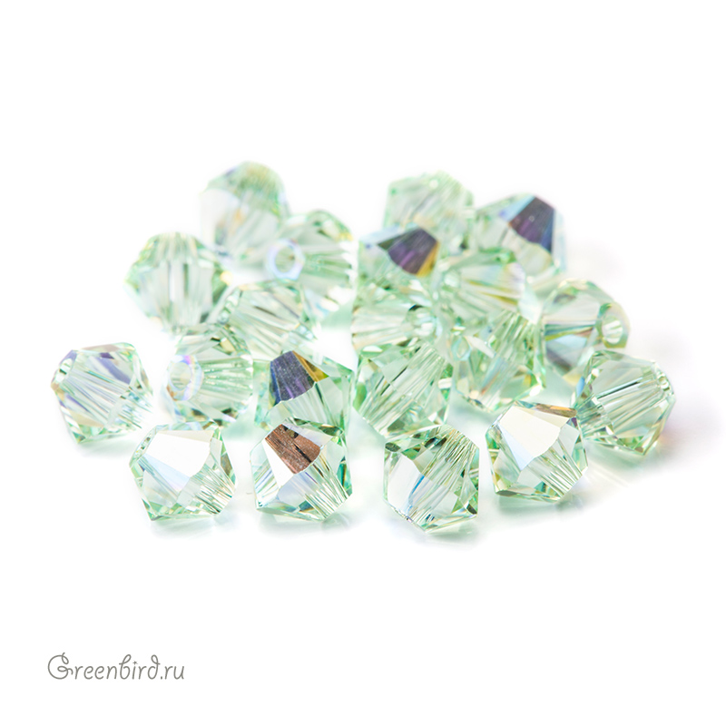 Компонент для бижутерии Swarovski – бусины-биконусы (Swarovski Биконусы). Размер: 4 мм, отверстие: 0,6 мм, цвет: Chrysolite AB (#238AB). Производство: Австрия. Цена указана за 20 шт.\n