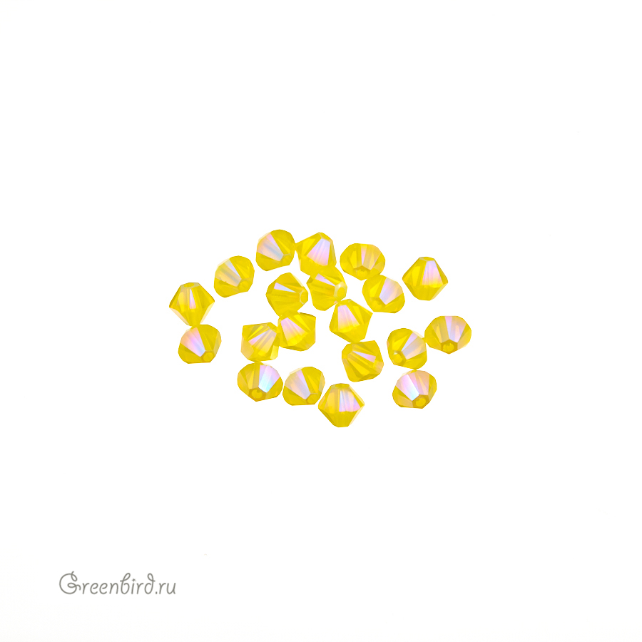 Компонент для бижутерии Swarovski – бусины-биконусы (Swarovski Биконусы). Размер: 4 мм, отверстие: 1 мм, цвет: Yellow Opal Shimmer 2X (#231SHIM2), мерцающий эффект нанесен на обе половинки бусины. Производство: Австрия. Цена указана за 20 шт.
