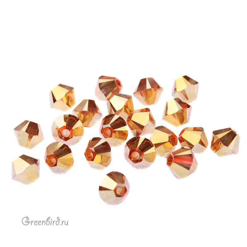 Компонент для бижутерии Swarovski – бусины-биконусы (Swarovski Биконусы). Размер: 4 мм, отверстие: 0,6 мм, цвет: Metallic Sunshine 2X (#001METSH2). Производство: Австрия. Цена указана за 20 шт.