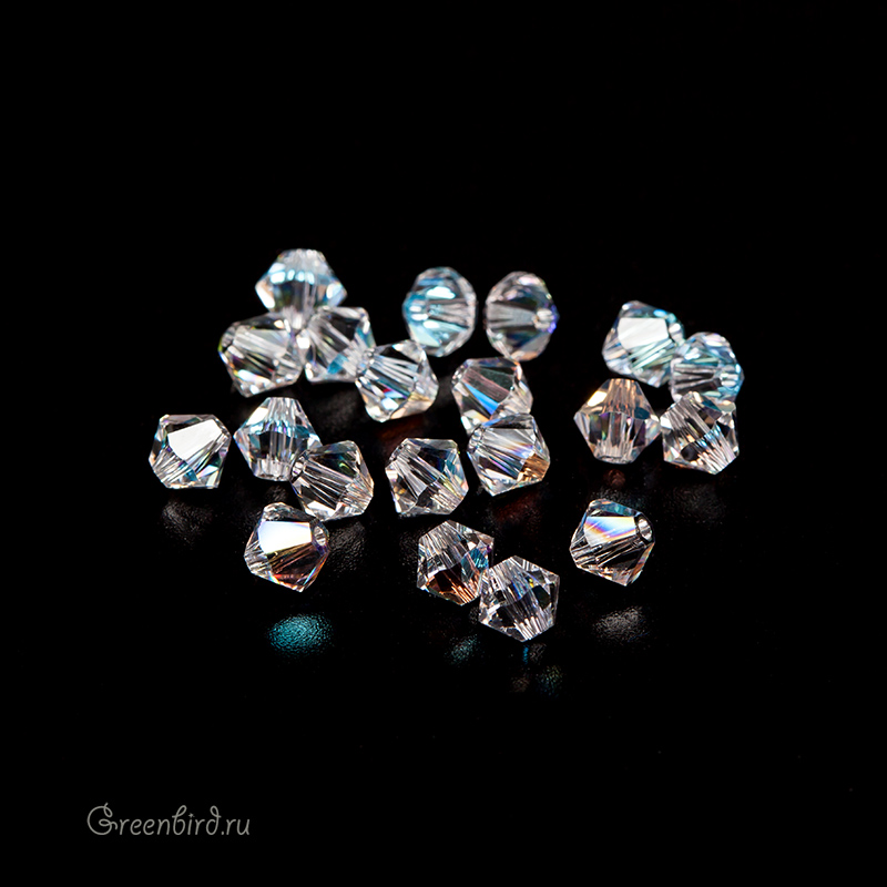 Компонент для бижутерии Swarovski – бусины-биконусы (Swarovski Биконусы). Размер: 4 мм, отверстие: 0,6 мм, цвет: Crystal Shimmer (#001SHIM). Производство: Австрия. Цена указана за 20 шт.