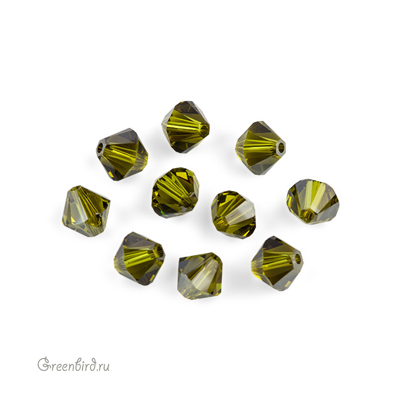 Компонент для бижутерии Swarovski – бусины-биконусы (Swarovski Биконусы). Размер: 6 мм, отверстие: 0,9 мм, цвет: Olivine Satin (#228SAT). Производство: Австрия. Цена указана за 10 шт.