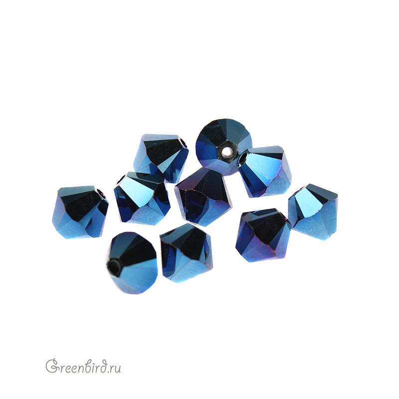 Swarovski 5328 Xilion Bicone Bead — биконусы или двуконусные бусины с фирменной огранкой Xilion. Эта огранка создаёт максимальный блеск за счёт дополнительных фасеток на гранях. Компонент для бижутерии и вышивки. Размер: 6 мм, отверстие: 0,9 мм. Цвет: прозрачный с эффектом "Синий металлик" с двух сторон кристалла / Crystal Metallic Blue 2X (#001METBL2). Материал: стекло. Производство: Австрия. Цена указана за 10 шт.