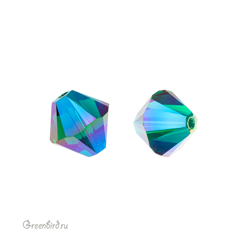 Компонент для бижутерии Swarovski – бусины-биконусы (Swarovski Биконусы). Размер: 8 мм, отверстие: 1,2 мм, цвет: Emerald AB 2X (#205AB2). Производство: Австрия. Цена указана за 1 шт.