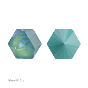Swarovski 4699 Prismatic Hexagon Fancy Stone — кристалл шестиугольной формы (гексагон) и фантазийной огранкой, создающей эффект призмы. Компонент для бижутерии и вышивки. Размер: 14 х 16 мм. Цвет: прозрачный на подложке "Шелковистый шалфей" c эффектом делайт без фольги / Crystal Silky Sage DeLite Unfoiled (#001L147D). Материал: стекло. Производство: Австрия. Цена указана за 1 шт.