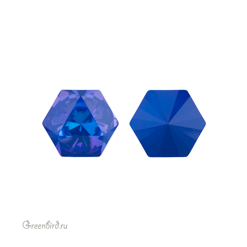 Swarovski 4699 Prismatic Hexagon Fancy Stone — кристалл шестиугольной формы (гексагон) и фантазийной огранкой, создающей эффект призмы. Компонент для бижутерии и вышивки. Размер: 6 х 6,9 мм. Цвет: прозрачный на синей подложке c эффектом делайт без фольги / Crystal Royal Blue DeLite Unfoiled (#001L110D). Материал: стекло. Производство: Австрия. Цена указана за 1 шт.