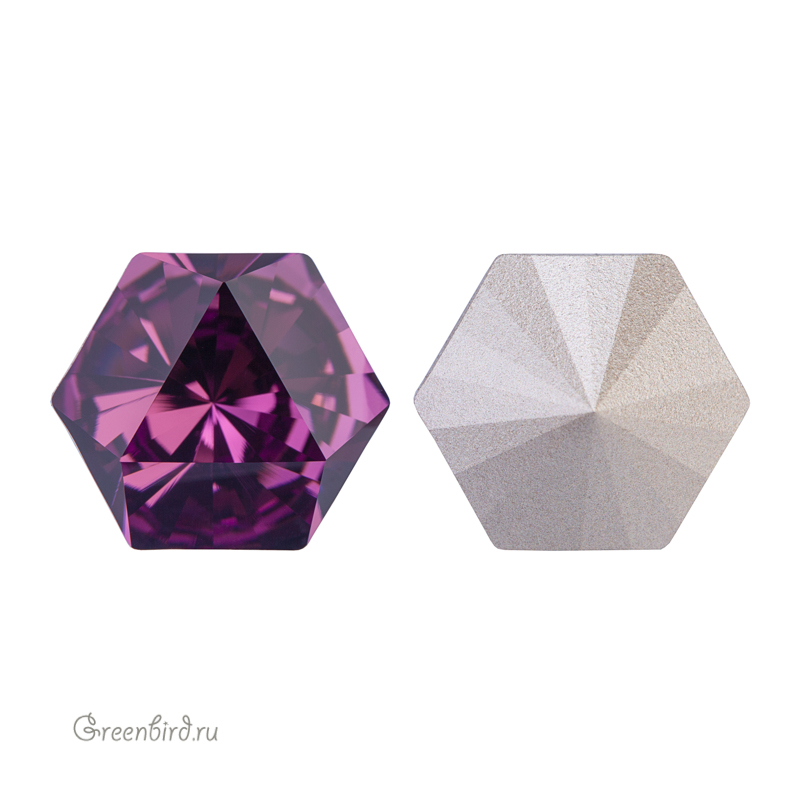 Swarovski 4699 Prismatic Hexagon Fancy Stone — кристалл шестиугольной формы (гексагон) и фантазийной огранкой, создающей эффект призмы. Компонент для бижутерии и вышивки. Размер: 14 х 16 мм. Цвет: аметист с фольгированием / Amethyst Foiled (#204). Материал: стекло. Производство: Австрия. Цена указана за 1 шт.