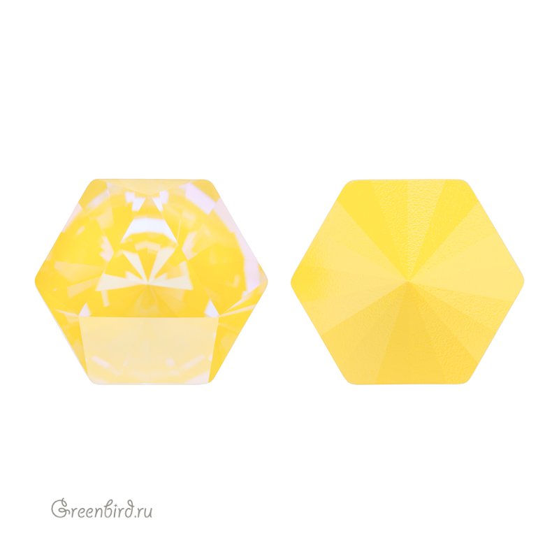 Swarovski 4699 Prismatic Hexagon Fancy Stone — кристалл шестиугольной формы (гексагон) и фантазийной огранкой, создающей эффект призмы. Компонент для бижутерии и вышивки. Размер: 14 х 16 мм. Цвет: прозрачный на подложке солнечного цвета c эффектом делайт без фольги / Crystal Sunshine DeLite Unfoiled (#001L141D). Материал: стекло. Производство: Австрия. Цена указана за 1 шт.
