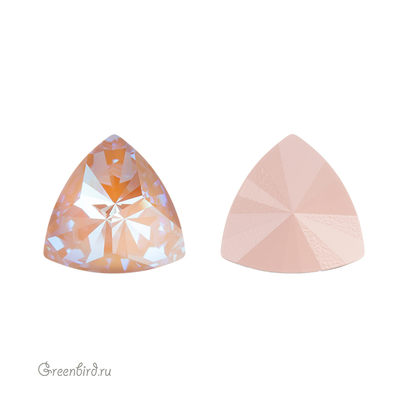 Swarovski 4799 Prismatic Triangle Fancy Stone — кристалл треугольной формы со скругленными сторонами и фантазийной огранкой, создающей эффект призмы. Компонент для бижутерии и вышивки. Размер: 14 х 14,3 мм. Цвет: прозрачный на пыльно-розовой подложке c эффектом делайт без фольги / Dusty Pink DeLite Unfoiled (#001L149D). Материал: стекло. Производство: Австрия. Цена указана за 1 шт.