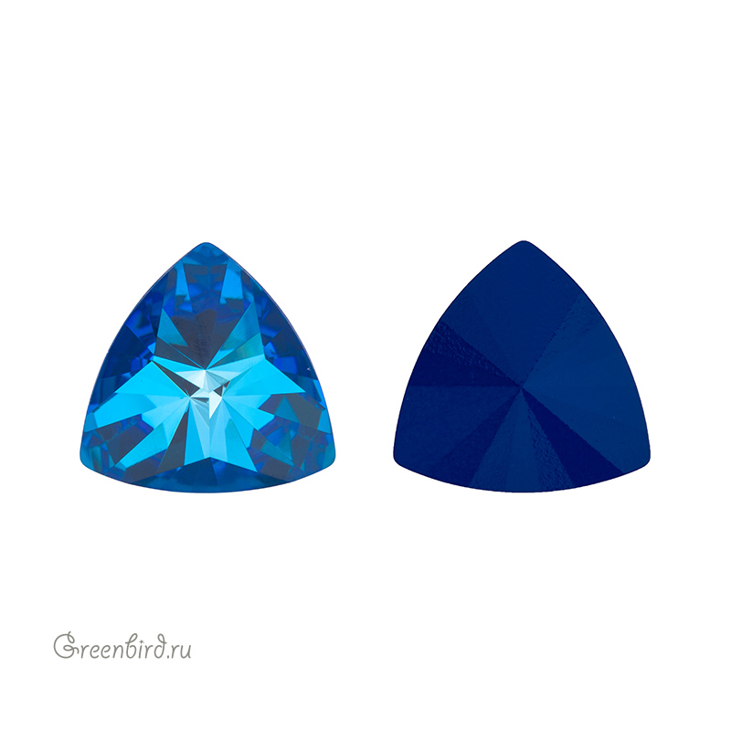 Swarovski 4799 Prismatic Triangle Fancy Stone — кристалл треугольной формы со скругленными сторонами и фантазийной огранкой, создающей эффект призмы. Компонент для бижутерии и вышивки. Размер: 14 х 14,3 мм. Цвет: прозрачный на синей подложке c эффектом делайт без фольги / Crystal Royal Blue DeLite Unfoiled (#001L110D). Материал: стекло. Производство: Австрия. Цена указана за 1 шт.