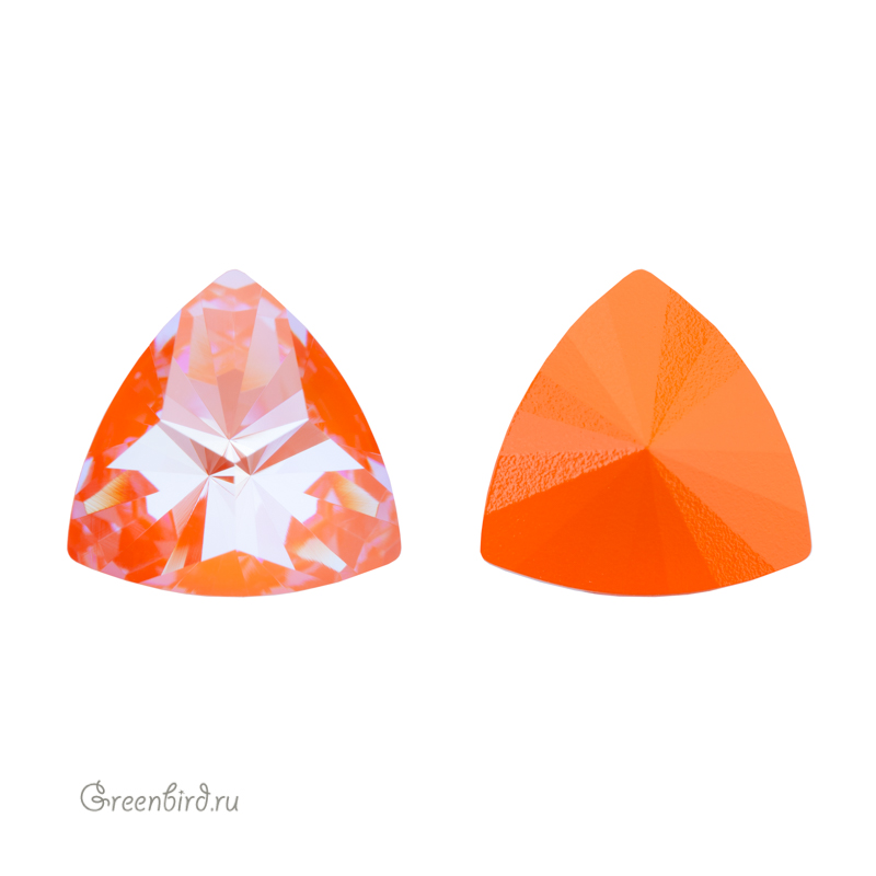 Swarovski 4799 Prismatic Triangle Fancy Stone — кристалл треугольной формы со скругленными сторонами и фантазийной огранкой, создающей эффект призмы. Компонент для бижутерии и вышивки. Размер: 14 х 14,3 мм. Цвет: прозрачный на подложке "Оранжевое сияние" c эффектом делайт без фольги / Crystal Orange Glow DeLite Unfoiled (#001L146D). Материал: стекло. Производство: Австрия. Цена указана за 1 шт.