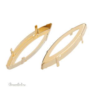 Оправа для ювелирных кристаллов – 4200 Marquise Fancy Stone FS. Размер: 35 х 9,5 мм, высота боковой стороны (без лапок): 5,7 мм, отверстия: 1,7 мм. Материал: томпак (разновидность латуни), покрытие: золото. Производство: Германия. Цена указана за 1 шт.