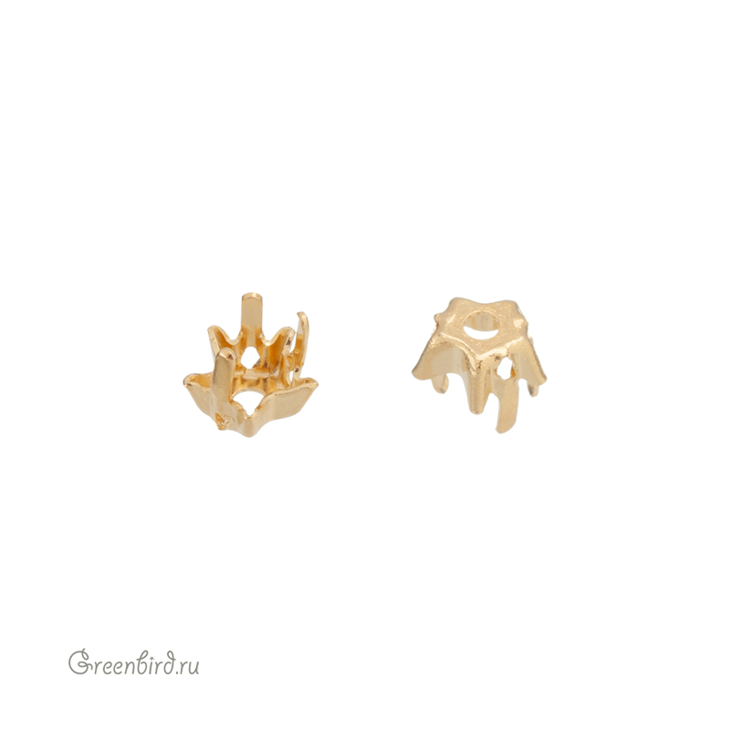 Оправа для ювелирных кристаллов – 4745 Star Fancy Stone. Размер: 5 мм, высота боковой стороны (без лапок): 2,06 мм, три отверстия: 0,5-0,6 мм. Материал: томпак (разновидность латуни), покрытие: золото. Производство: Германия. Цена указана за 1 шт.