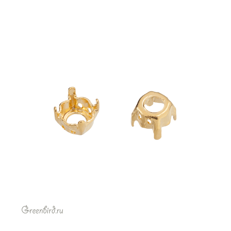 Оправа для ювелирных кристаллов – 1088 Chaton. Размер: SS22 (6,2 мм), высота боковой стороны (без лапок): 3,3 мм, отверстия: 0,8 мм. Материал: томпак (разновидность латуни), покрытие: золото. Производство: Германия. Цена указана за 1 шт.