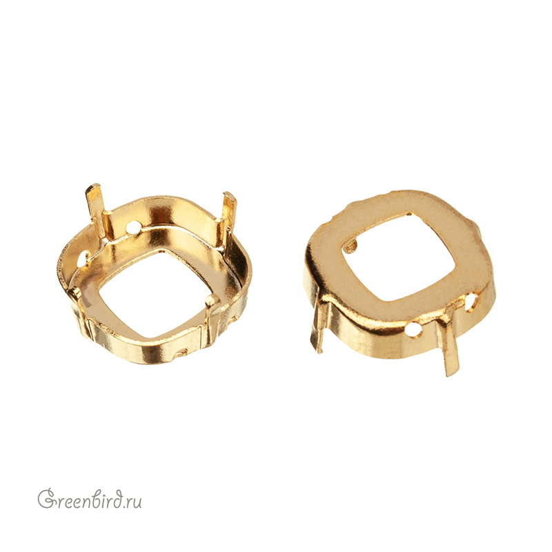 Оправа для ювелирных кристаллов Тонкий Кушон Квадрат - 4483 Thin Cushion FS. Размер: 14 мм, высота боковой стороны (без лапок): 3,4 мм, отверстия: 0,8-1 мм. Материал: томпак (разновидность латуни), покрытие: золото. Производство: Германия. Цена указана за 1 шт.