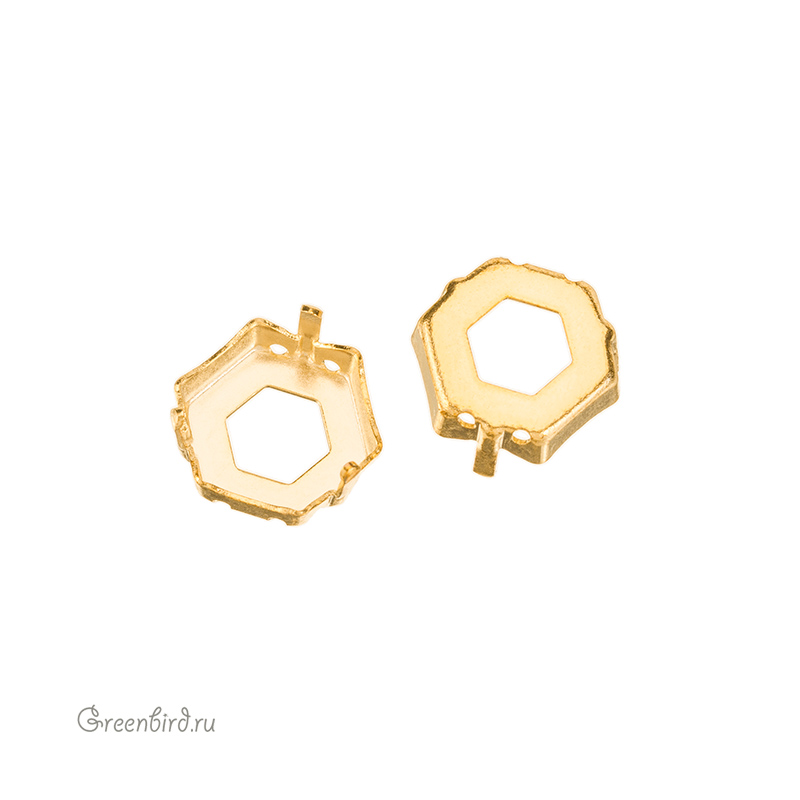 Оправа для ювелирных кристаллов – 4683 Thin Hexagon Fancy Stone. Размер: 14 х 15,8 мм, высота боковой стороны (без лапок): 3,8 мм, отверстия: 1 мм. Материал: томпак (разновидность латуни), покрытие: золото. Производство: Германия. Цена указана за 1 шт.
