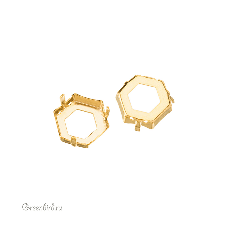 Оправа для ювелирных кристаллов - 4683 Thin Hexagon Fancy Stone. Размер: 12 х 13,5 мм, высота боковой стороны (без лапок): 3,4 мм, отверстия: 1 мм. Материал: томпак (разновидность латуни), покрытие: золото. Производство: Германия. Цена указана за 1 шт.