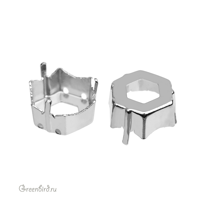 Оправа для кристаллов Swarovski – 4699 Prismatic Hexagon Fancy Stone. Размер: 14 х 16 мм, металл: томпак (разновидность латуни), покрытие: родий. Цена указана за 1 шт.