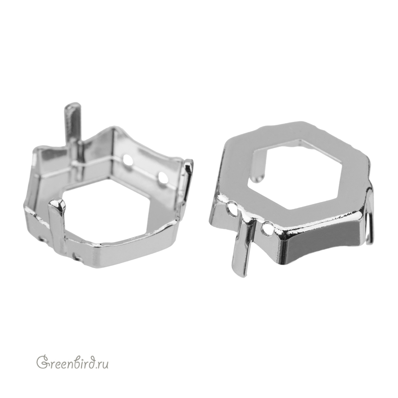 Оправа для кристаллов Swarovski – 4683 Thin Hexagon Fancy Stone. Размер: 14 х 15,8 мм, металл: томпак (разновидность латуни), покрытие: родий. Цена указана за 1 шт.
