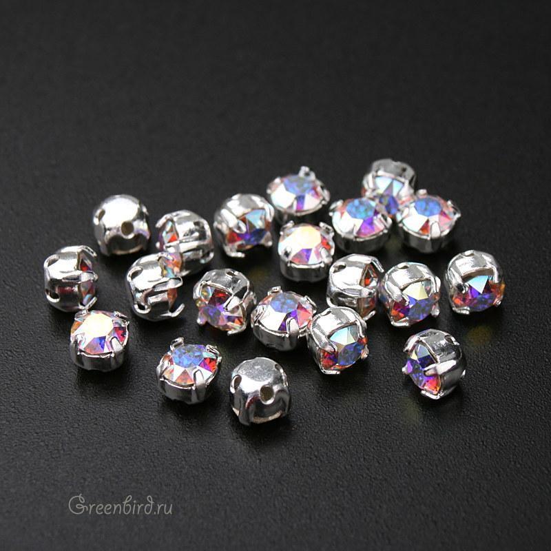 Шатоны с кристаллом Swarovski в оправе (Chaton Montees). Размер: 4 х 4 х 3,5 мм, четыре отверстия: 0,9 мм. Материал: латунь, покрытие: серебро. Кристалл арт. 1088, цвет: Сrystal Aurore Boreale (#001AB), размер: PP31/SS16 (3,80 – 4,00 мм). Производство: Австрия. Цена указана за 20 шт.